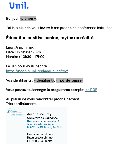 Votre message contient des mises en forme, des variables, l’URL de votre événement, le logo de l’Unil et votre signature sous forme d’image.